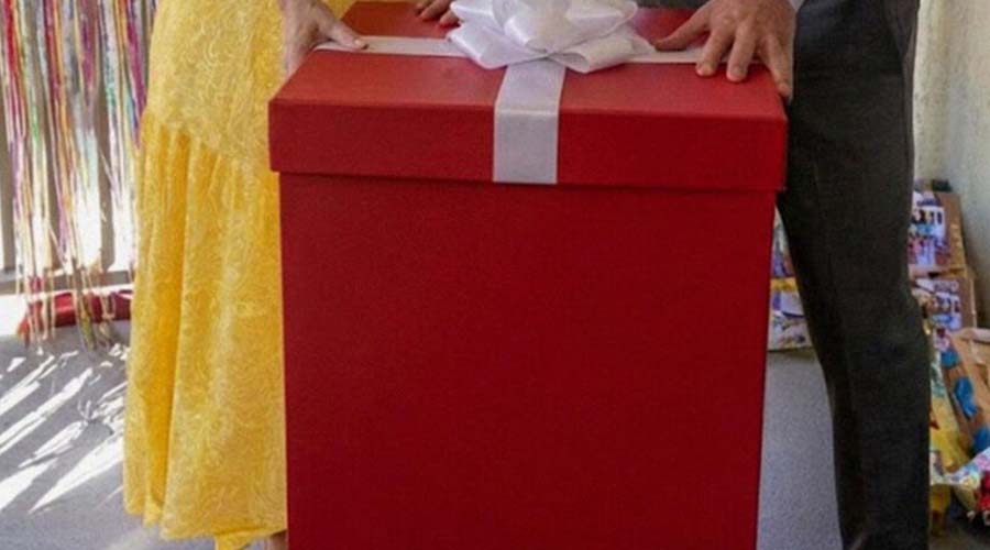 He grinned, played it up, tugged on the bow, lifted the lid.