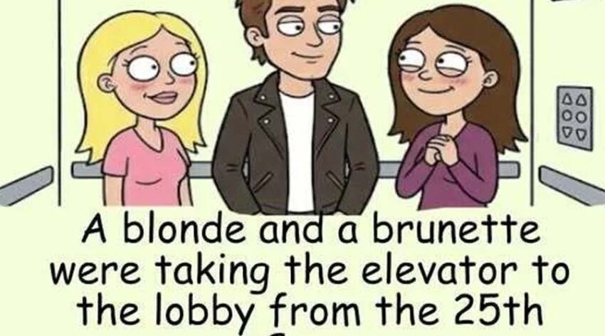 A blonde and a brunette were taking the elevator to the lobby from the 25th floor. On the 23rd floor, a great looking man with ruffled hair gets into the elevator. The women exchange a look acknowledging just how good looking this man is.