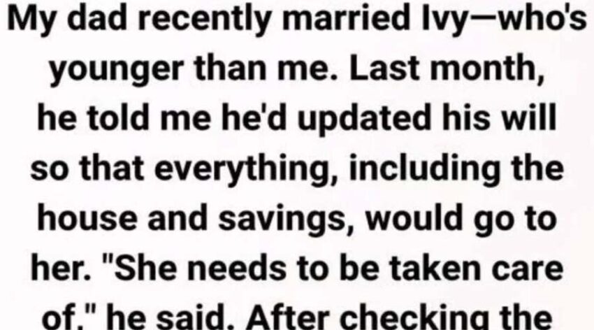 My dad’s new wife, Ivy, is younger than me — he’s 61, she’s 27, and I’m 32. When he told me last month that he’d updated his will so that everything — the house, the savings, all of it — would go to her, I was stunned. When I questioned him, he just shrugged and said, “Your mother left you the heirlooms, and you’ve got a good job.