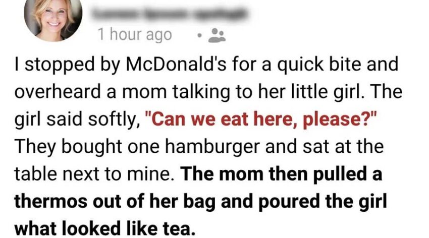 I stopped at McDonald’s for a quick meal and overheard a little girl asking her mom if they could eat there. They ordered just one hamburger and sat beside me. From a worn bag, the mother poured tea from a small thermos, and I soon realized they had just come from a hospital visit. She had only enough money for their bus ride home, but she bought the burger because her daughter had always wanted to try McDonald’s “just once.” The little girl savored every bite, while her mother watched with a tired yet loving smile.