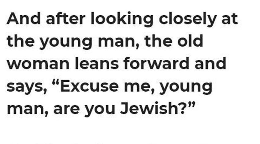 A young man sat quietly on a train, absorbed in his book, when an elderly woman across from him leaned forward and asked, “Excuse me, young man, are you Jewish?” He looked up politely. “No, ma’am, I’m not.” A few minutes later, she asked again, a little more insistently. He repeated his answer, still courteous. After a third round of questioning — “Are you quite sure you’re not Jewish?” — the young man, now visibly irritated, sighed and said, “All right, yes, I am Jewish!” The woman paused, studied him carefully, and replied, “That’s funny. You don’t look Jewish.” Sometimes persistence doesn’t lead to clarity — just irony.