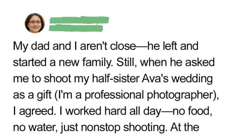 When my half-sister Ava asked me to photograph her wedding for free, I hesitated. We barely knew each other—our connection existed only through our father, who left my mom when I was three and started a new family. Still, hoping to be the bigger person, I agreed on one condition: I’d be treated like family, not just the help.