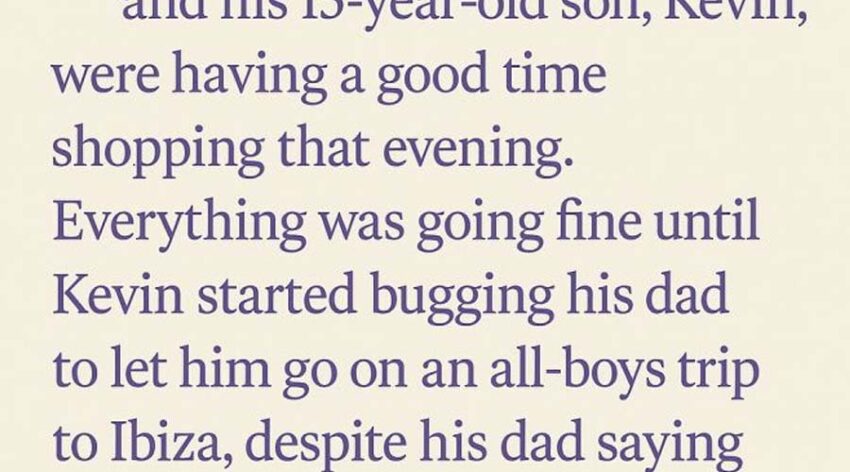 Mr. Frazer, a wealthy lawyer, and his 15-year-old son, Kevin, were enjoying a relaxed evening of shopping. Everything seemed fine until Kevin started nagging his father about letting him go on an all-boys trip to Ibiza.