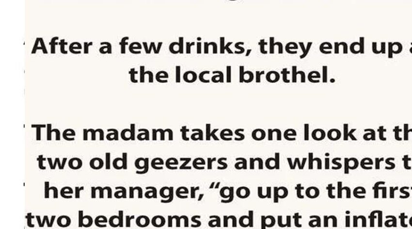 Two old men decide they are close to their last days and decide to have a last night on the town. After a few drinks, they end up at the local brothel. The madam takes one look at the two old geezers and whispers to her manager, “Go up to the first two bedrooms and put an inflated doll in each bed.