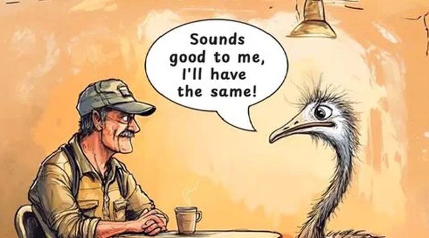 The waitress, still eyeing the emu, finally curiously asked, “So, what about the bird?”