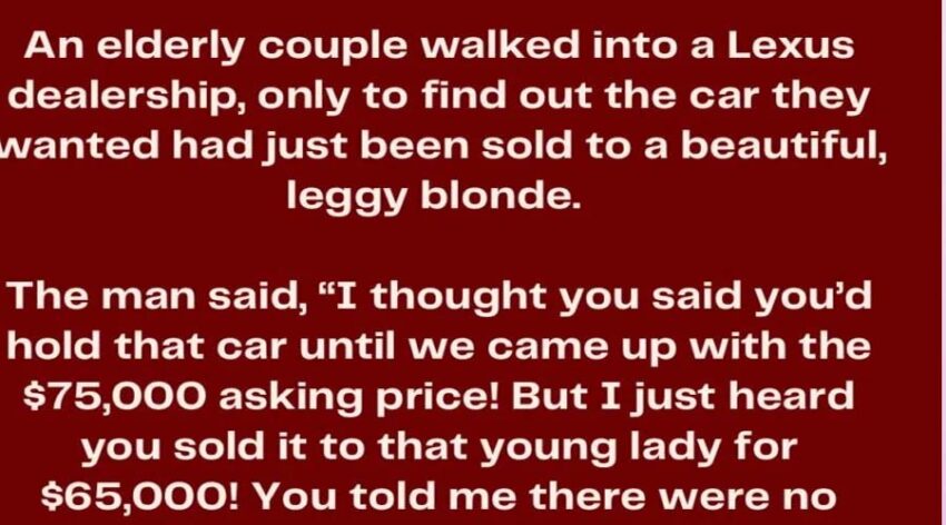An elderly couple walked into a Lexus dealership, only to find out the car they wanted had just been sold to a beautiful, leggy blonde. The man said, “I thought you said you’d hold that car until we came up with the $75,000 asking price! But I just heard you sold it to that young lady for $65,000!