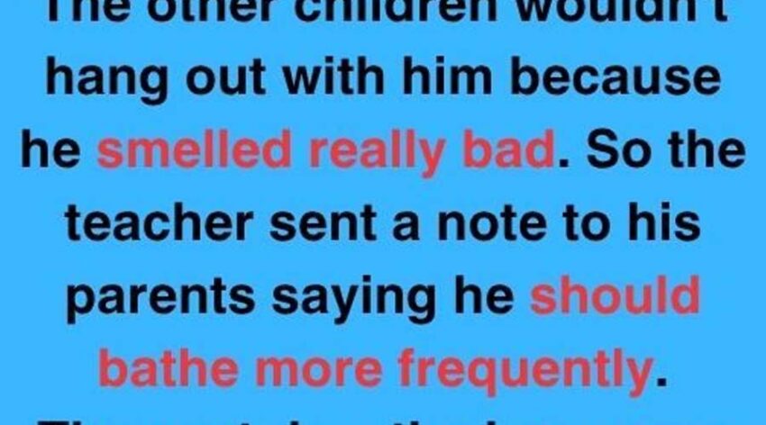 There was a particularly unhygienic kid in the class. The other children wouldn’t hang out with him because he smelled really bad. So the teacher sent a note to his parents saying he should bathe more frequently.