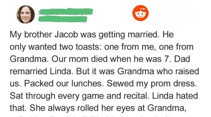 Dad remarried when I was 13, but Linda never really made an effort. She mocked Grandma from day one, and it hurt every time. Jacob, my brother, kept it simple—he wanted only me and Grandma to give toasts at his wedding.