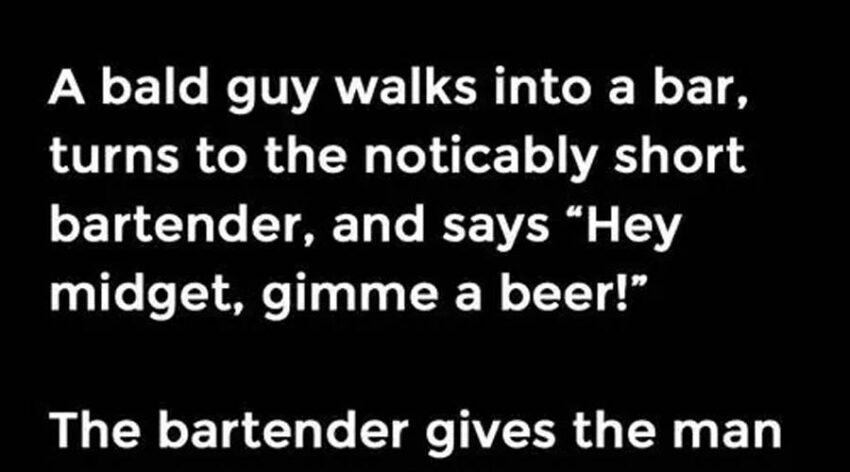 The bartender gives the man a beer, but tells the man not to refer to him as a midget. A few drinks later, the guy turns to the bartender and again says, “hey midget… gimme another beer!”