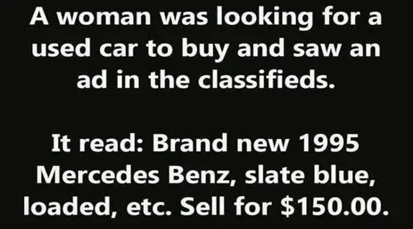 A woman was looking for a used car to buy and saw an ad in the classifieds. It read: Brand new 1995 Mercedes Benz, slate blue, loaded, etc. Sell for $150.00.